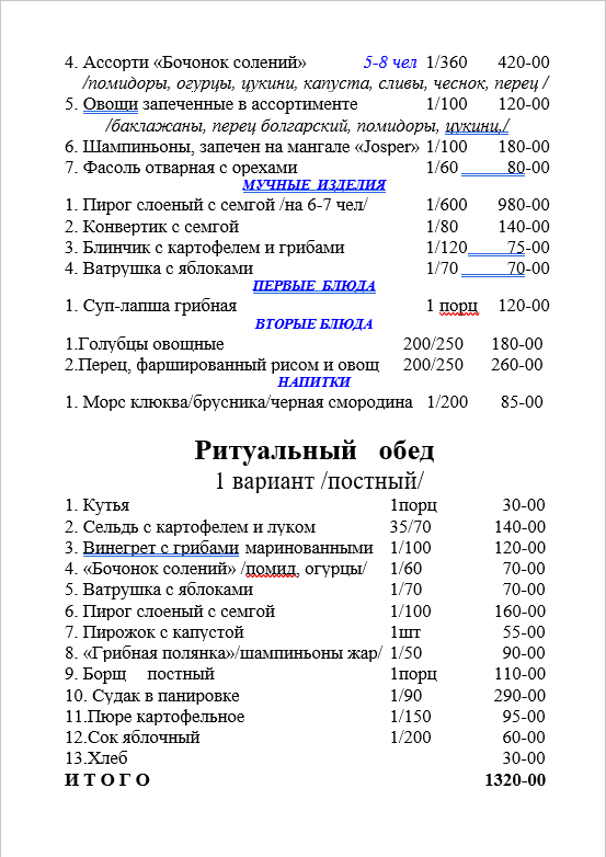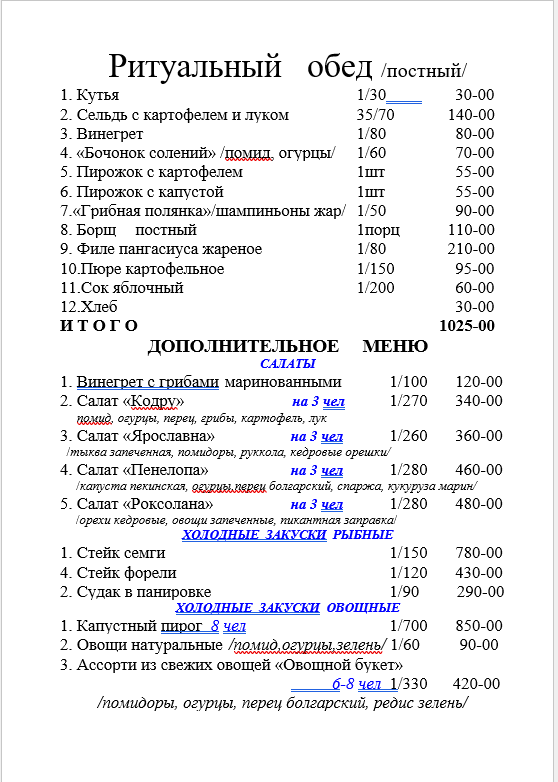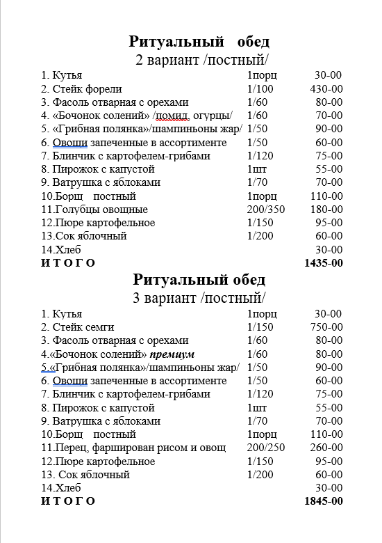 Стандартный вариант. Расчет сделан на 1 человека. Ниже представлены блюда из дополнительного меню